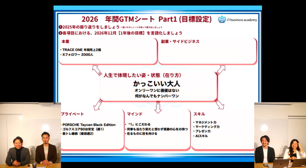 今回の講義は、年間12回ある6原則スキル講義の内年2回しかない特別セッション。今回はテーマを「年間GTMシート作成」とし、司会は平賀鈴菜氏が務め、i3 business academy代表の海野翼氏、講師である三輪創琉氏、前田啓希氏とともに進行しました。