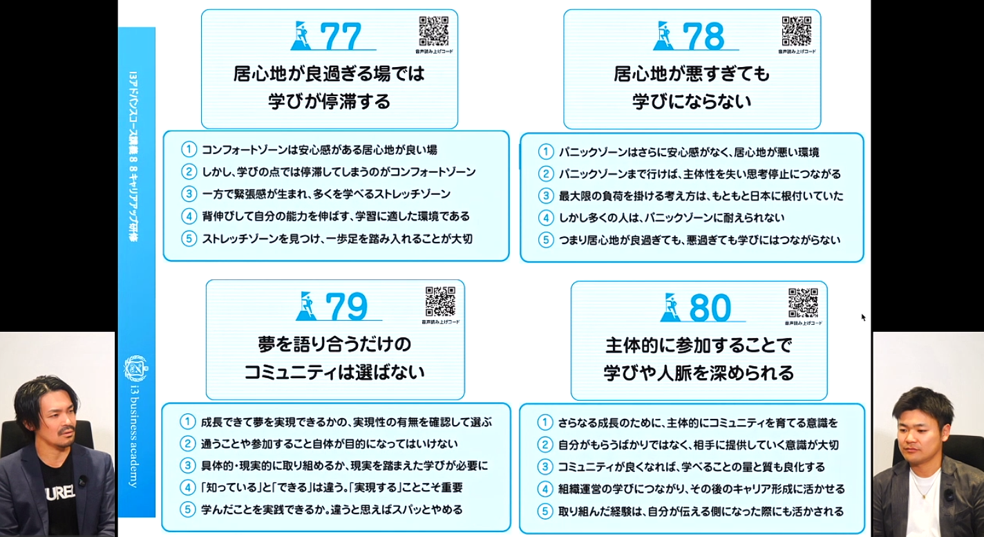 後半の4テーマでは、学びの質を最大化する環境設定と姿勢について深掘りが行われました。 居心地が良すぎる場所は安心感はあるものの成長が止まってしまい、逆に居心地が悪すぎてもストレスで学びが阻害されるため、適度な緊張感のある環境選びが大切であることが強調されました。 また、具体的な行動が伴わず夢を語り合うだけのコミュニティに安住せず、現実を変える力を持つ場を選ぶべきであること、そして、どのような環境であっても主体的に参加する姿勢を持ってこそ、学びや人脈を真に深いものにできるという本質が伝えられました。