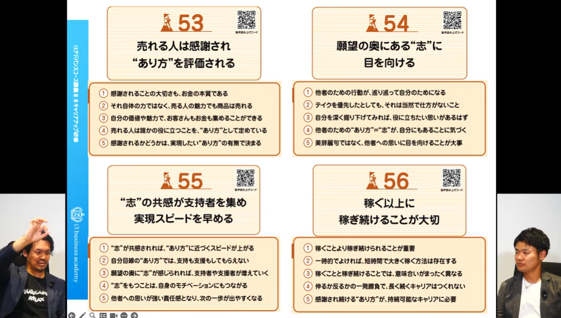 「年齢や経験にとらわれず、素直に真似る姿勢を持ちましょう。まずは基本をしっかり押さえた上で、工夫を重ねてください。見た目を真似ることも成果につながります。ラクに稼ぐことばかりを求めず、お金の本質を理解し、地道な努力を続けましょう。売れる人は“あり方”が評価され、感謝される存在です。願望の奥にある“志”に目を向け、志に共感する仲間とともに実現のスピードを高めてください。稼ぐこと以上に、稼ぎ続ける力を身につけることが大切です。日々の実践を通じて成長していきましょう。」